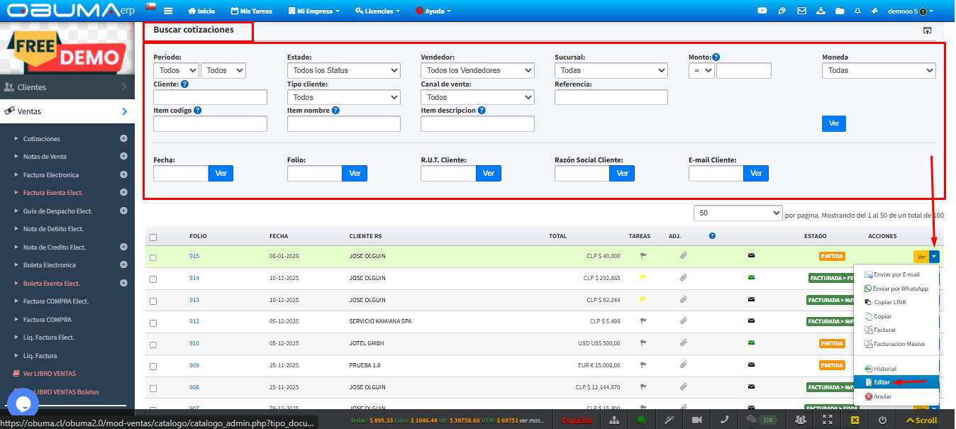 Editar cotizaciones, le permitira modificar el contenido de los Items cotizados, modificar observacion ingresada, modificar detalle en la descripcion o agregar un nuevo descuento.