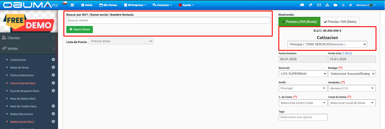 - Perfil : OBUMA permite emitir cotizaciones con perfiles de fantasia distintos, logos y nombres de fantasia distintos al principal de la empresa. Si es el caso, debes seleccionar el perfil al que pertenece la cotización.