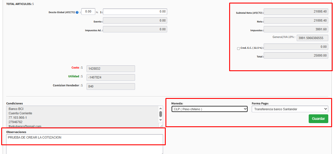 - Referencia : Esta referencia es un texto libre, idealmente para diferenciar cotizaciones emitidas a un mismo cliente.