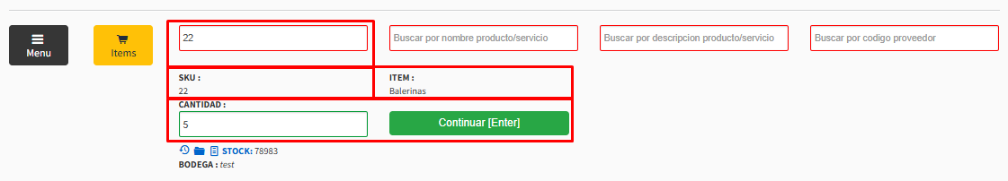 1.- Ingresar el codigo sku o codigo de barra del producto, si el sistema lo encuentra en la base de datos, le permitira ingresar la cantidad deseada.