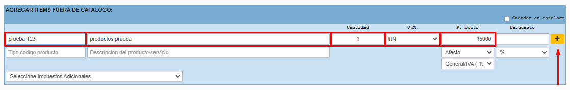 Para agregar items fuera de catalogo, debe ingresar los datos, como en el siguiente ejemplo: