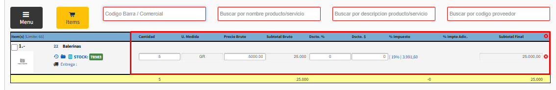 4. Agregar los items ( productos y/o servicios ) que componen el detalle de la cotización.
