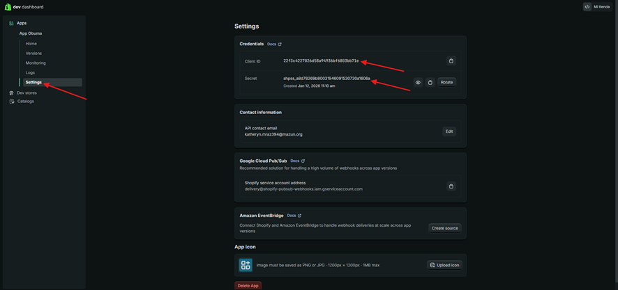 Con ello tenemos las credenciales de shopify que son Client ID, Secret, Access Token.