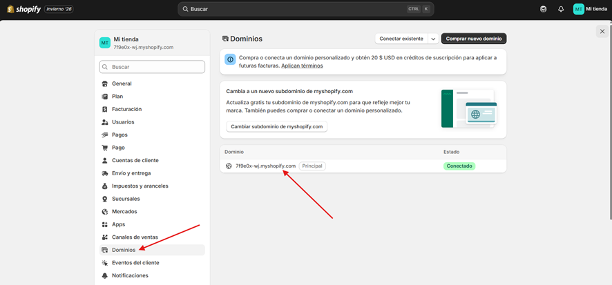 Luego, ir a Dominios, en esta sección vamos a buscar el dominio que por defecto entrega Shopify, que termina con “.myshopify.com”. Para este caso es “7f9e0x-wj.myshopify.com”.
