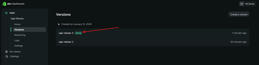 Luego se muestra el listado de las versiones creadas, donde la versión activa es quien tiene la etiqueta Active.