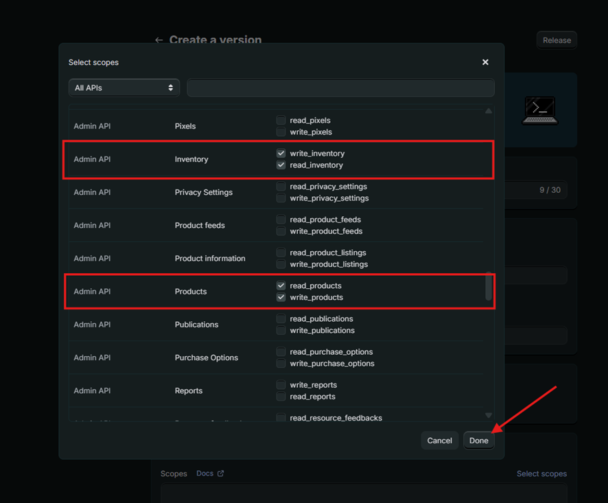 Luego Activar la lectura, escritura de Productos e Inventario, luego hacer clic en Done para guardar.