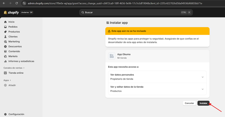Ahora Shopify muestra una ventana de permisos, seleccionar instalar.