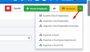 - Opciones: Importar lista de empleados (nuevos empleados o actualizar informacion existente); Importar lista Empleados Avanzados y Exportar a Excel infromacion de empleados