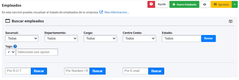La primera parte de la busqueda es con campos incluyentes: Sucursal, Departamento, Cargo, CeCo, Estado y tags